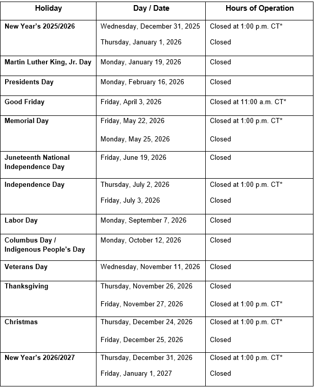 The MPF Program will observe the following 2026 holiday schedule (below), based in part on the Securities Industry and Financial Markets Association® (SIFMA®) recommended operating calendar for 2026.