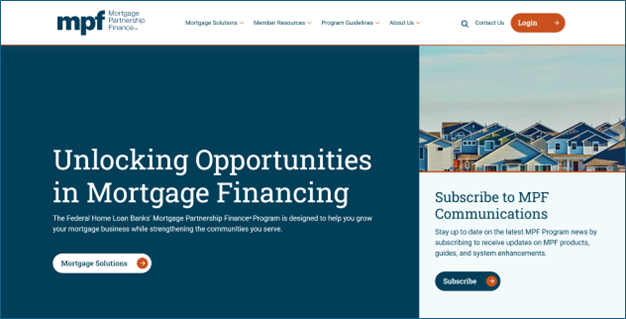 This weekend, the MPF Program will launch a redesigned website (fhlbmpf.com) that delivers a more intuitive, modern, and efficient digital experience. This update also introduces a new centralized point of entry for accessing MPF applications.