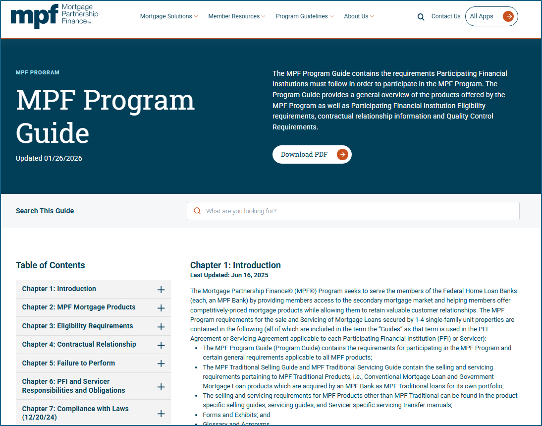 Our MPF Guides are moving from static PDFs to fully searchable webpages, offering an improved browsing experience with intuitive navigation, a streamlined table of contents, and easier access to chapter- and section-level information. Downloadable PDFs will remain available for your reference.